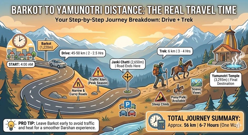| Barkot to Janki Chatti | 45–50 km | Taxi / Bus | 2 to 2.5 Hours |
