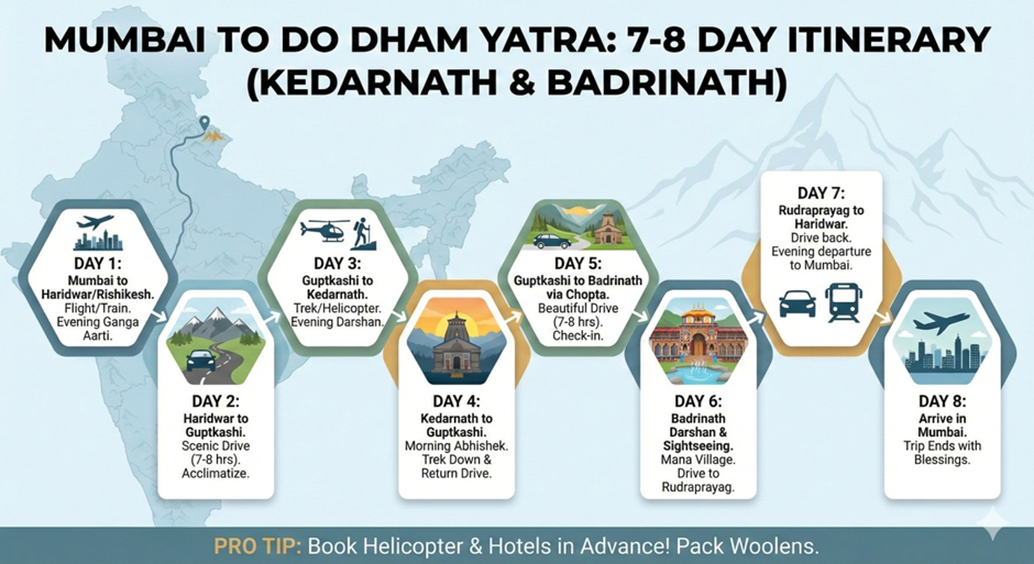 Planning a well-paced itinerary is essential for a comfortable and spiritually fulfilling Do Dham Yatra from Mumbai. A7–8-day itinerary is ideal as it balances travel time, acclimatization, and darshan without rushing.