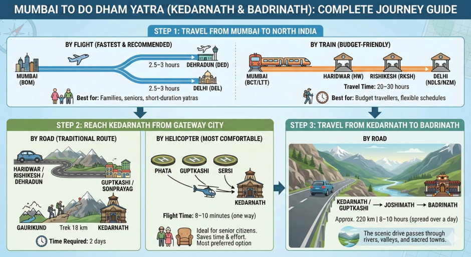 Reaching Do Dham (Kedarnath & Badrinath) from Mumbai involves a combination of air, rail, and road travel. Proper planning ensures a smooth and comfortable journey, especially for first-time pilgrims and senior citizens.