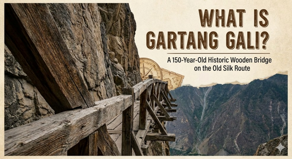 Gartang Gali is not just a bridge. It is a piece of history. It is a 136-meter-long wooden bridge built on a vertical rock face. It looks like a balcony hanging in the sky.