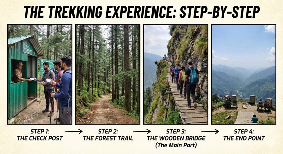 The first part of the trek is through a dense forest. It is a mix of Pine and Deodar trees. The path goes up and down, but it is not very steep. You will walk for about 1.5 km to 2 km on a dirt path. It is peaceful and quiet. You can hear the birds singing.