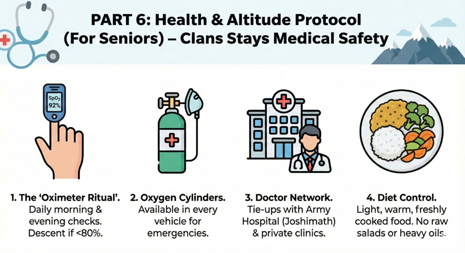 - Diet Control: Altitude slows digestion. We ensure your parents eat light, warm, and freshly cooked food. No raw salads. No heavy oils.