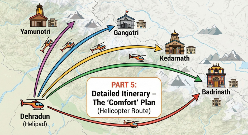 - The Helicopter: Private flying from Dehradun (Sahastradhara). No driving on mountain roads.