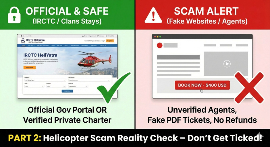 We book the entire helicopter. It flies from a private helipad in Dehradun. There is no queue. There is no scam. It is 100% legal, transparent, and guaranteed.