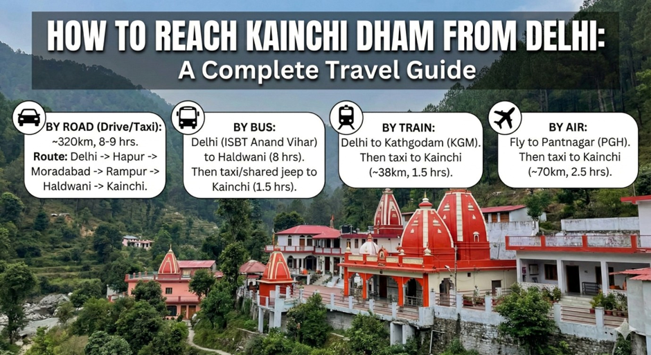 | Delhi → Moradabad → Haldwani → Bhowali → Kainchi Dham | ~300 km | 7–8 hours |