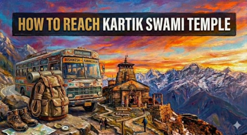 Reaching Kartik Swami Temple is a beautiful journey through the Garhwal Himalayas. The temple is accessible by road up to Kanakchauri village, followed by a short trek.
