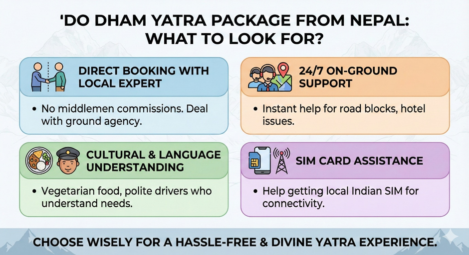 When you are booking a Do Dham Yatra package from Nepal, be careful. Many agents in Kathmandu are just “middlemen.” They take your booking and pass it to someone else in India. This increases the cost and lowers the service quality.