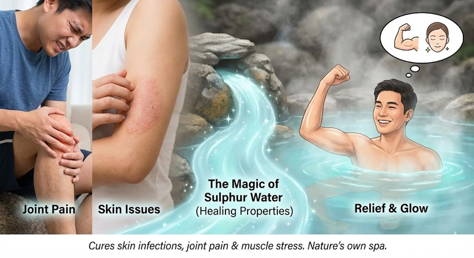 Old people and Ayurveda experts say that this sulphur water is medicinal. It can cure: