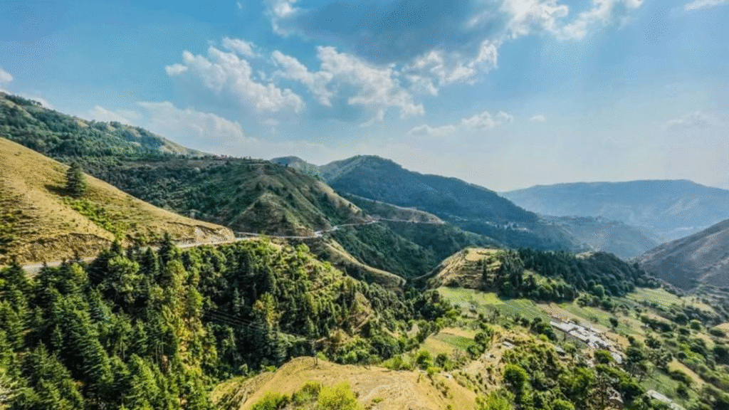 Kanatal becomes a scenic winter wonderland when covered with snow. The rolling hills and surrounding forests are lightly dusted, offering tranquil views and peaceful surroundings.