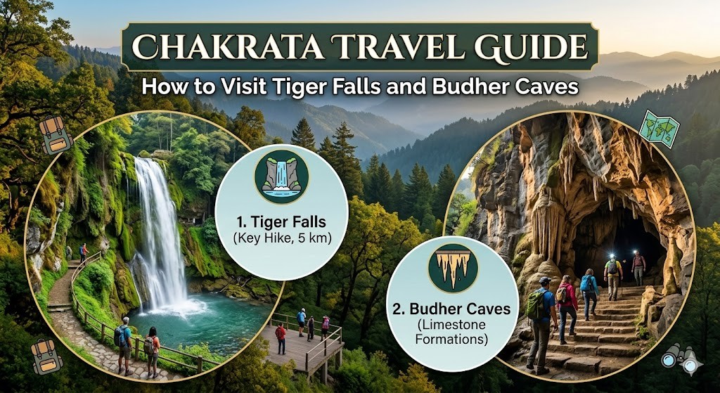 Chakrata is one of the most peaceful hill stations in Uttarakhand. Surrounded by dense forests, waterfalls, and quiet mountain villages, it is perfect for travellers who want to escape crowded tourist places. This Chakrata Travel Guide will help you plan the perfect trip. From how to reach these hidden gems to the best time to visit, this guide covers everything you need to know. If you are planning a short mountain getaway, this Chakrata Trip Guide with Tiger Falls and Budher Caves will make your journey easier and more enjoyable. Why Visit Chakrata? Chakrata is a small cantonment town located about 90 km from Dehradun. Unlike busy hill stations like Mussoorie, Chakrata offers quiet landscapes, fresh air, and beautiful forest trails. Here are a few reasons why travellers love Chakrata: Tiger Falls: The Highest Waterfall in Uttarakhand Tiger Falls is one of the most beautiful waterfalls in the region. With a height of about 312 feet, it is considered one of the highest direct waterfalls in Uttarakhand. Why Tiger Falls is Special How to Reach Tiger Falls Tiger Falls is one of the most beautiful attractions near Chakrata and is famous for its scenic forest trek and tall cascading waterfall. Located about 20 km from Chakrata town, reaching Tiger Falls is fairly easy and suitable for most travellers. By Road The most convenient way to reach Tiger Falls is by road. You can drive or hire a taxi from Chakrata town. Route:Chakrata → Lokhandi → Tiger Falls Road Point The road journey takes around 45–60 minutes depending on traffic and weather conditions. The last point accessible by vehicle is the Tiger Falls parking area. Short Trek to the Waterfall After reaching the parking area, visitors need to walk down a 1 km forest trailto reach the base of the waterfall. Trek Details The trek offers beautiful views of the surrounding hills and thick deodar forests, making it a pleasant experience for nature lovers. By Taxi or Local Transport Local taxis are available in Chakrata that can take you directly to the Tiger Falls Road point. Many travellers also hire shared jeeps or private taxis for a day trip covering Tiger Falls and nearby viewpoints. Route from Major Cities Starting Point Distance to Chakrata Travel Time Dehradun 90 km 3–4 hours Mussoorie 75 km 3 hours Delhi 330 km 8–9 hours From Chakrata, it takes about 1 hour to reach Tiger Falls by road. Travel Tips Budher Caves: The Mysterious Limestone Caves Budher Caves are ancient limestone caves located near Chakrata. These caves are believed to have connections with the Mahabharata era. Legend says that the Pandavas stayed here during their exile. The caves are located inside dense forests, which makes the journey exciting and adventurous. What Makes Budher Caves Unique The caves are part of the famous Miola Top trekking route, offering beautiful views of the Himalayan ranges. How to Reach Budher Caves Budher Caves are one of the most fascinating natural attractions near Chakrata. These ancient limestone caves are surrounded by dense forests and open meadows, making the journey just as exciting as the destination. Budher Caves are located about 30 km from Chakrata town and require a short trek to reach the cave entrance. By Road from Chakrata The easiest way to reach Budher Caves is by road from Chakrata. Route:Chakrata → Lokhandi → Lohari Village → Budher Caves Trail Point The drive takes around 1.5 hours and passes through scenic forest roads and small villages. You can travel by private car, bike, or hire a local taxi from Chakrata. Trek to Budher Caves After reaching the road head near Lohari Village, visitors need to trek through a forest trail to reach the caves. Trek Details The trail passes through beautiful meadows and thick deodar forests. Many trekkers also combine this route with the Miola Top trek, which offers stunning Himalayan views. By Taxi or Local Transport Local taxis are available in Chakrata that can take you to the Budher Caves trek starting point near Lohari Village. Many visitors book a taxi for the entire day to explore both Tiger Falls and Budher Caves. Nearby Places to Explore in Chakrata Deoban Deoban is a peaceful forest area about 13 km from Chakrata, famous for its dense deodar trees and stunning Himalayan views. It is a perfect place for nature walks, bird watching, and quiet moments in nature. Chilmiri Neck Chilmiri Neck is the highest point in Chakrata and one of the best places to watch the sunset. Visitors can enjoy panoramic mountain views and a calm environment ideal for photography. Kanasar Kanasar is a scenic forest destination located about 25 km from Chakrata, known for its ancient deodar trees and lush greenery. It is a great spot for picnics, relaxing nature walks, and peaceful mountain views. Yamuna Adventure Park Yamuna Adventure Park offers exciting outdoor activities near the Yamuna River. Visitors can enjoy zip-lining, rope activities, and adventure experiences surrounded by beautiful natural scenery. Moila Top Moila Top is a beautiful meadow near Budher Caves that offers stunning views of the Himalayan ranges. The trek to this place passes through dense forests and open grasslands, making it a favourite for trekkers. Best Time to Visit Chakrata Chakrata is a beautiful hill destination that can be visited throughout the year. However, the best time depends on the type of experience you want, whether it is trekking, sightseeing, or enjoying snowfall. Summer (March – June) Summer is one of the best times to visit Chakrata as the weather remains pleasant with temperatures between 10°C and 25°C. It is perfect for exploring Tiger Falls, Budher Caves, and nearby trekking trails. Monsoon (July – September) During monsoon, Chakrata becomes lush and green with misty mountain views and flowing waterfalls. However, heavy rains may make trekking trails slippery, so travellers should plan carefully. Autumn (October – November) Autumn offers clear skies and stunning views of the Himalayan